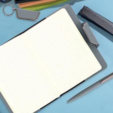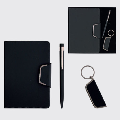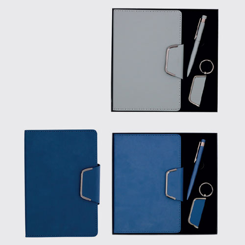 coffret raffiné comprend un notebook, un stylo à bille et un porte clés, tous assortis avec une finition en simili cuir de haute qualite.