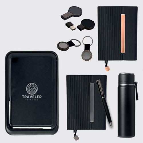 Coffret 6 pièces: carnet de notes, Clé USB 16 Go, Porte dés, Stylo, powerbank et mug